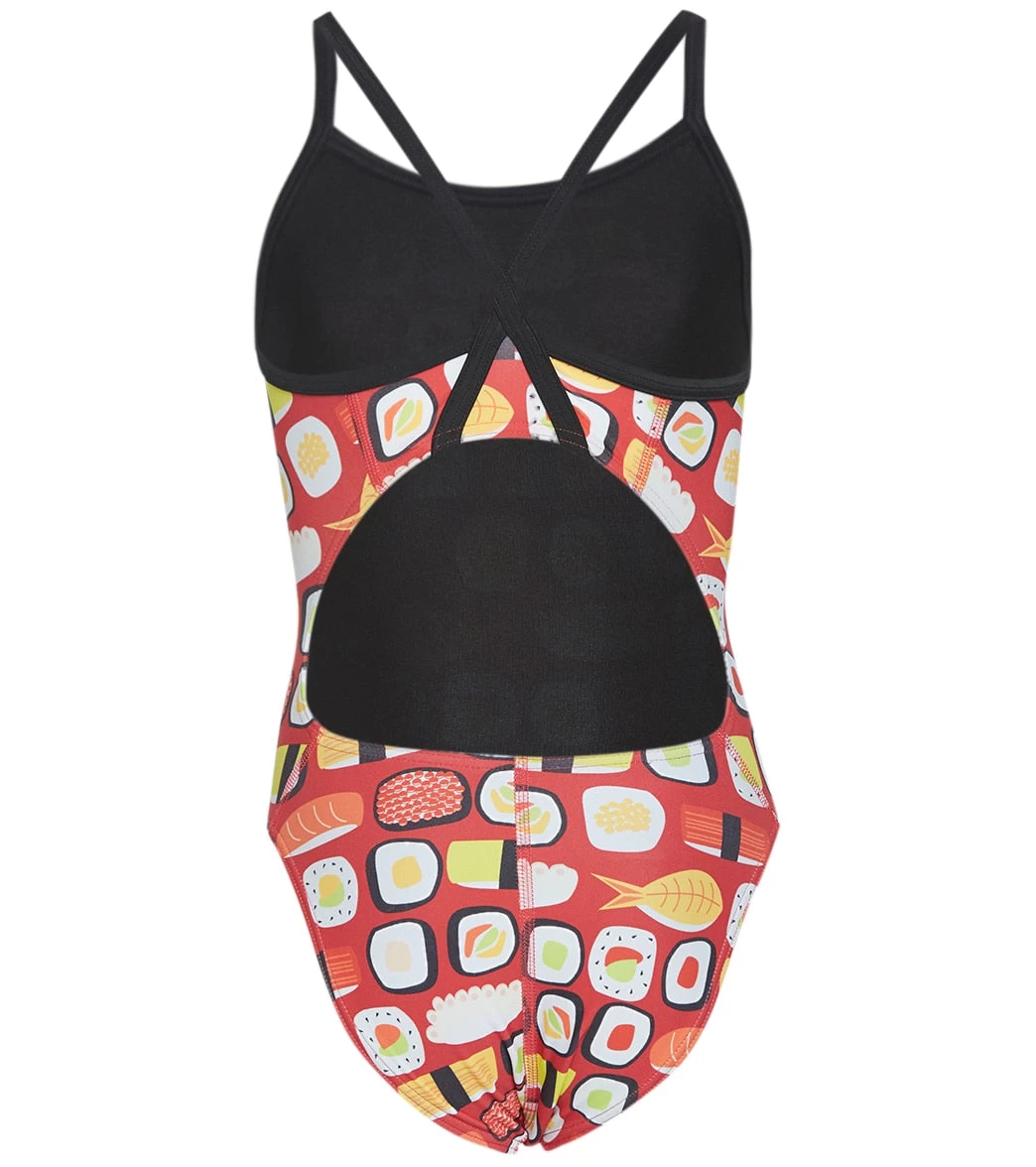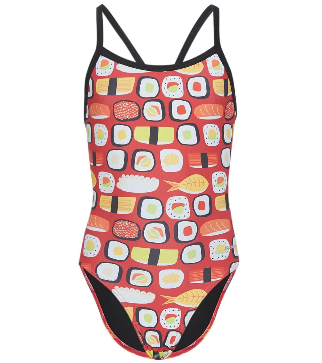 The Youth Sporti Sushi Thin Strap One Piece Swimsuit makes a fun statement! Designed to conform to your body and optimize your range of motion in the water.