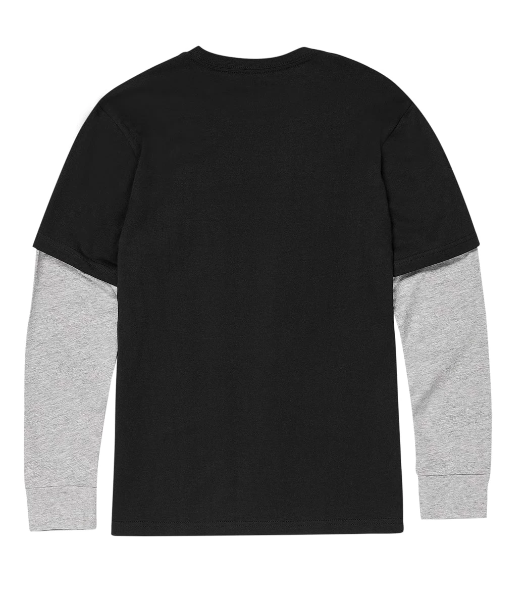 Make your life easier and give them that layered look without the fuss. The Volcom Boys’ Bandstone Twofer Long Sleeve Tee (Big Kid) gives off that True- To – This hesh skater vibe in a modern fit, crafted out of a cotton-poly blend.
